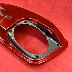 Cut the plastic basket off of the under side of the lid with an oscillating multi-tool followed by a grinder. You'll want a flat mounting surface for the kit to bolt up to. Be very careful of the painted surface of the lid. It is easy to damage. Do Not grind off the four factory speaker grill mounting points!!!