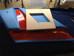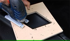 Once these four holes have been drilled, flip the bag over and bolt the 3/4" template in place. The template is marked at the top corner. Correct positioning is evident. The four holes will only line up if you have the template positioned correctly. One mounting hole is closer to the grill opening than the other three. This hole is at the top/rear.Drill a starting hole in the bag and cut out the hole for the grill. Leave 1/8"-1/4" of material around the edge. Don't try to cut directly up to the template. Note: Fiberglass bags require a jig saw blade that is hardened steel. A smooth cut Hardwood blade works well for this. A metal cutting blade would be ideal, however, metal cutting blades are generally too short in length for the job. A Bosch T101BF hardwood blade works well.
