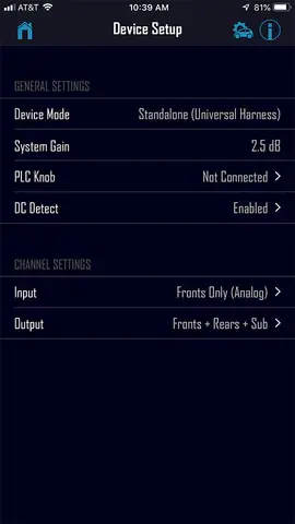System Gain: Should always show 0.00 dB for factory radios. Settings for aftermarket radios (low level RCA signal) may show higher numbers here. This is because the DSR1 will boost the signal in order to account for the lower signal strength.