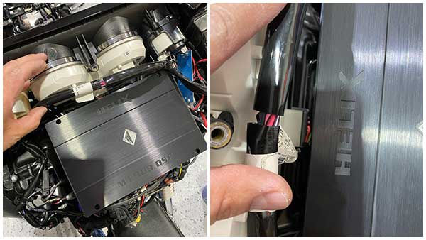 The Helix M Four and M Four DSP amplifiers fit ‘14 and later Street, Ultra, and Electra Glides nicely without any modifications to the bike. The amplifier can be mounted on top of the radio using an amplifier mounting pad like the ones that come with American Hard Bag fairing amplifier power kits.
