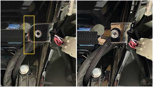 Remove the two plastic wire retainer tabs at the front of the headlight. Cut them off and grind the surface flush. These two tabs are only for holding factory wire harnesses in place and are not structural. After the installation is complete these two mounting points will no longer be needed for those wire harnesses.