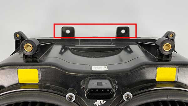 Remove some plastic material from the headlight between the two upper mounting points (both left and right sides). This also can be done with a die grinder. Be sure not to grind past or into the brass inserts. Only remove the portion marked in red in the pic below.