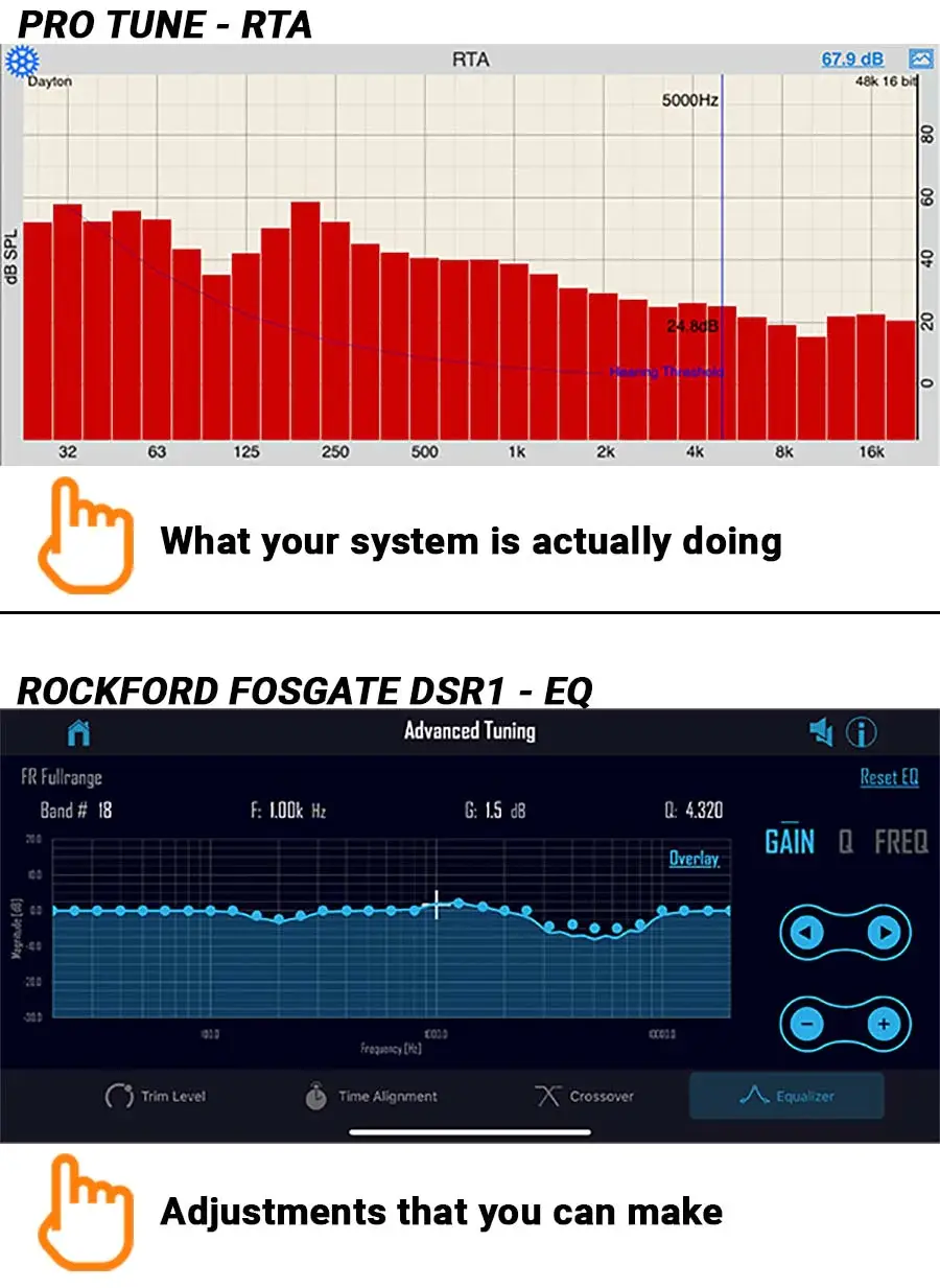Pro Tune is an accessory kit for your smartphone that turns your phone into a Display that shows what adjustments need to be made to your equalizer in your sound system. This type of measurement and display system is called a Real Time Analyzer. Or RTA. Which is a very simple but powerful tool to have when tuning a sound system.