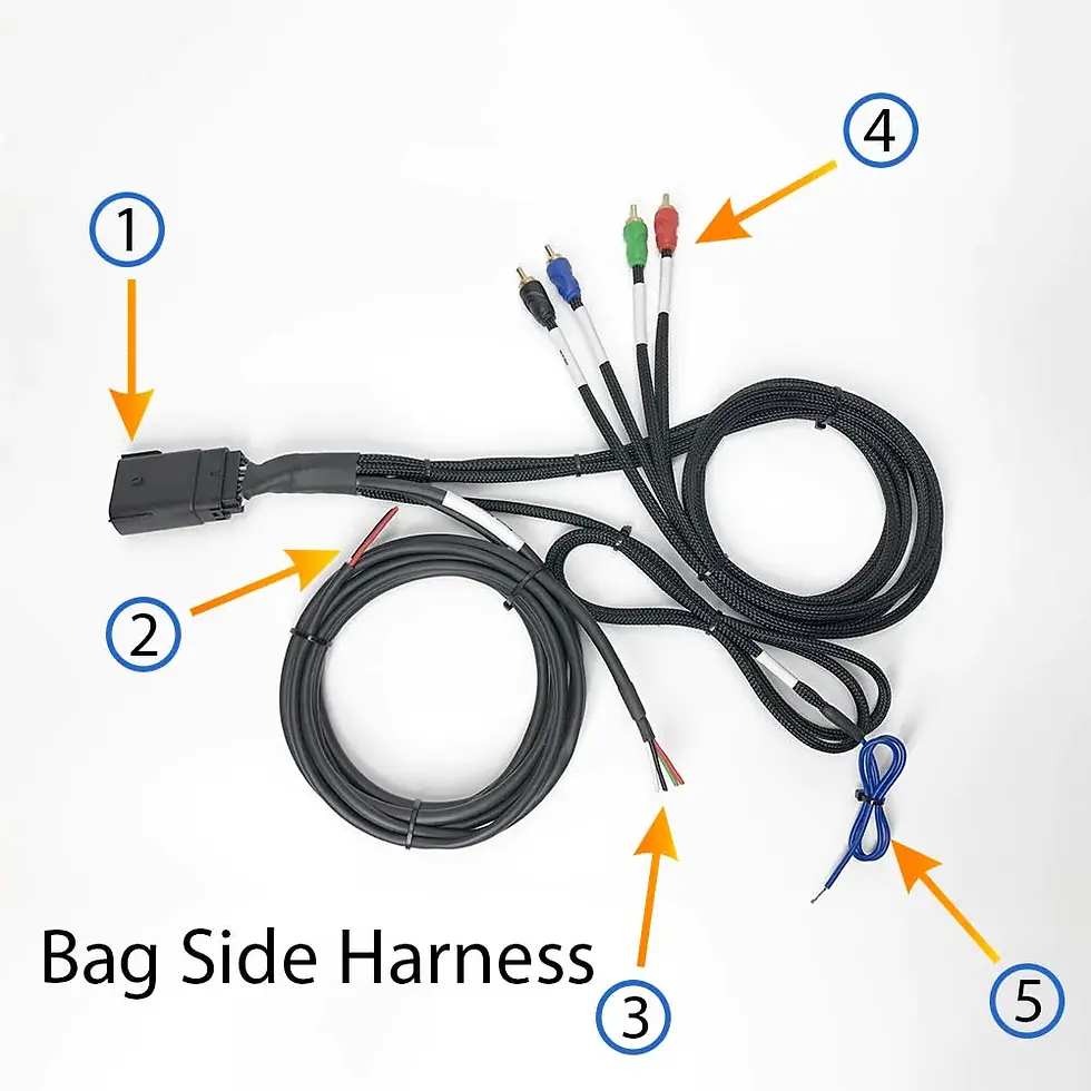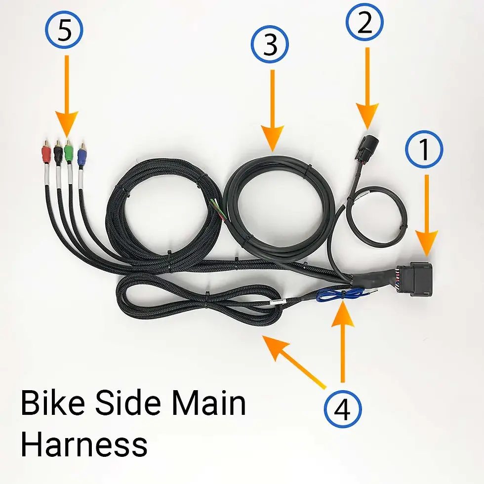 Identify the main harness and the direction that all circuits will run on the bike (RCAs, turn-on, and speaker circuits). The main harness is made up of two distinct parts that contain remote turn-on, RCA and speaker circuits. Some custom harnesses will not have RCAs integrated into the main harness. We make them both ways.