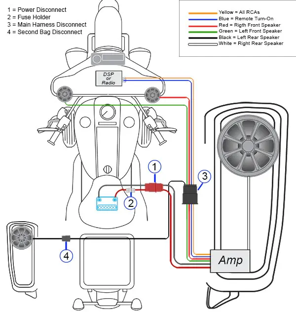 Note: Though this diagram shows the amplifier in the right side bag, this kit will work equally as well with the amplifier in either the left or right side bag. This harness even works for installing the amplifier in a tour pack.