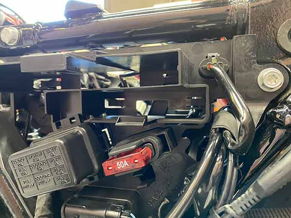 Locate the power connector in the side cover area where the bag side of the harness can reach. Don’t leave too much slack or the side cover may be difficult to put back in place. Once situated, use a zip tie to tether the power input and output cables to a solid structure such as the frame or the factory fuse box structure.