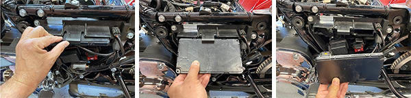Route the cable with the 2 pin black plug (#2 in pic 1 above) to the opposite side of the bike and locate it in the side cover area in front of the bag without the amplifier. This is the connection for speakers in the second bag with no amp. The best way to do this is to remove the battery from the bike and route the cable either in front of or behind the battery. Do not route this cable over the top of the bikes frame. Unbolt the bike's fuse holder assembly on the clutch side of the bike.