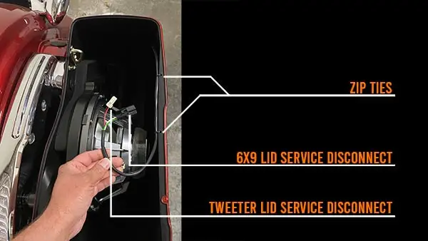 Install the lid speakers and the speaker disconnects for both tweeters as well as woofers in each lid
