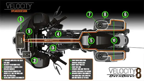 Use this harness to make active 4 channel saddlebag speakers fully plug and play with the Velocity 8 and an additional external amplifier to power the lid midrange speakers.