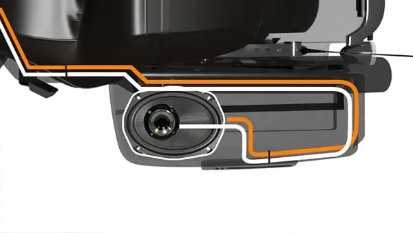 It is important to understand that the speaker wire inside the saddlebag is to be routed around the outside walls of the bag starting from the front inside wall. Route the harness towards the back of the bag, then cross over to the outside wall and then up to the lid hinge.